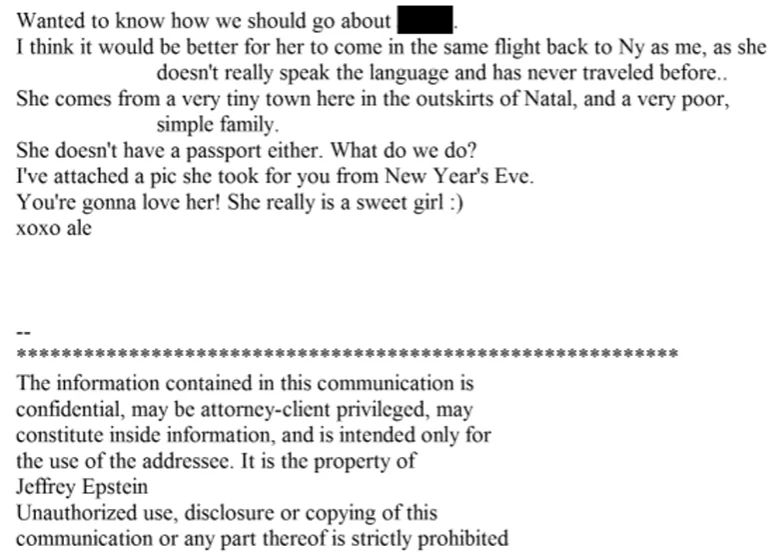 Em um e-mail datado de novembro de 2010, um remetente relata a Jeffrey Epstein que circulava por João Pessoa, Recife e Natal. Na mensagem, afirma ter “conseguido uma garota” e detalha planos de retorno aos Estados Unidos via São Paulo, onde teria contato com um agente.